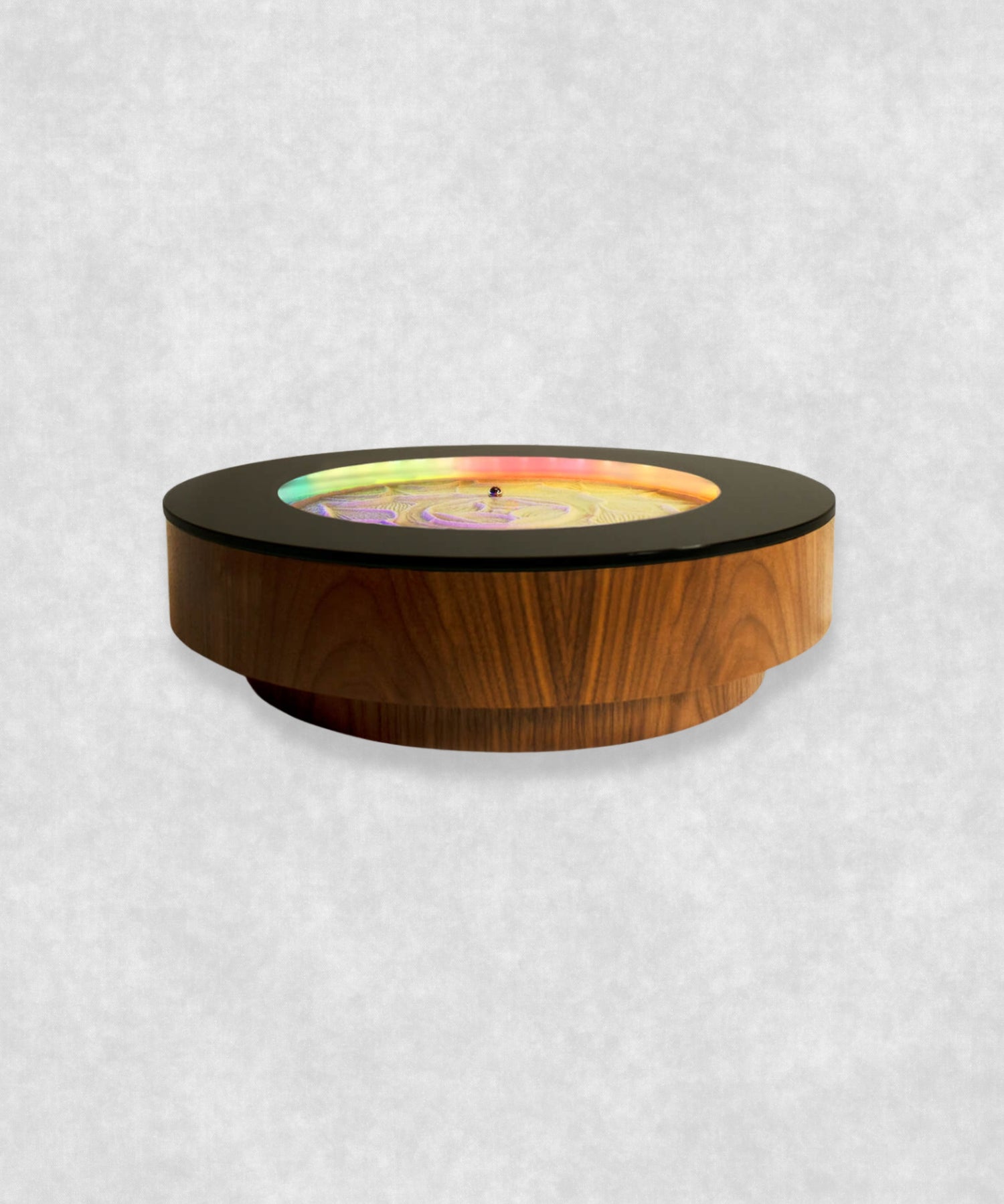 Encerrada bajo una refinada superficie de cristal, una esfera de acero se mueve silenciosamente por la fina arena, guiada por un mecanismo magnético invisible.